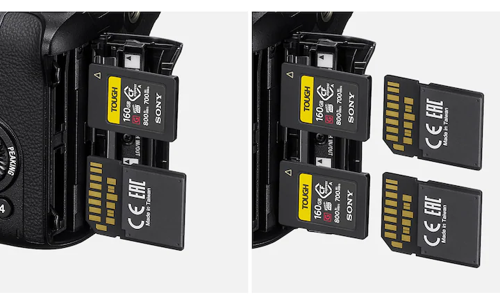 Kamera jest wyposażona w dwa gniazda na nośniki obsługujące zarówno karty CFexpress typu A, jak i karty SDXC/SDHC klasy UHS-I i UHS-II. CFexpress typu A to nowy standard kompaktowych nośników danych odznaczających się dużą prędkością zapisu i odczytu. Można na nie nagrywać filmy 4K o dużej przepływności. Dwa gniazda dają możliwość zapisu naprzemiennego lub równoczesnego.